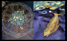‘Ocean-blue and cosmic dust’. Title of this 1.5 by 1.5 meter tapestry. Here are some details.